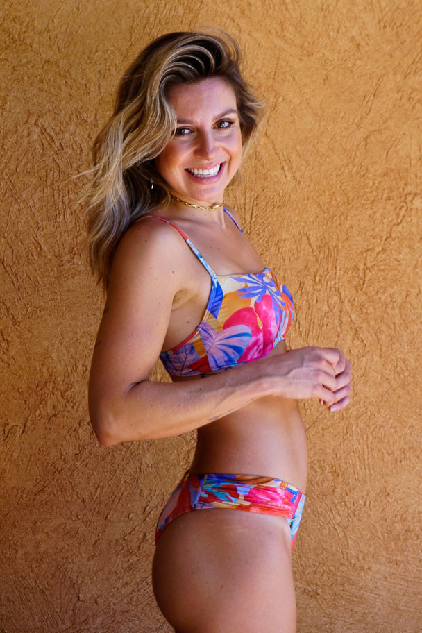 Top faixa com bojo. Calcinha média com lateral franzida.